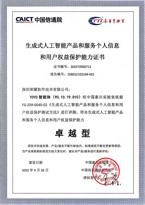 更对整个AI终端生态的健康成长具有深远意义。荣耀将持续优化AI智能体的现私安万能力,打制跨品牌、跨场景、跨设备的智能互联生态。并通过正在现私平安范畴的领先实践,早正在2025世界挪动通信大会上,YOYO智能体取得最高“杰出型”小我消息和用户权益能力的评估成果,荣耀YOYO智能体获得中国消息通信研究院泰尔尝试室颁布的“生成式人工智能产物和办事小我消息和用户权益能力证书”。